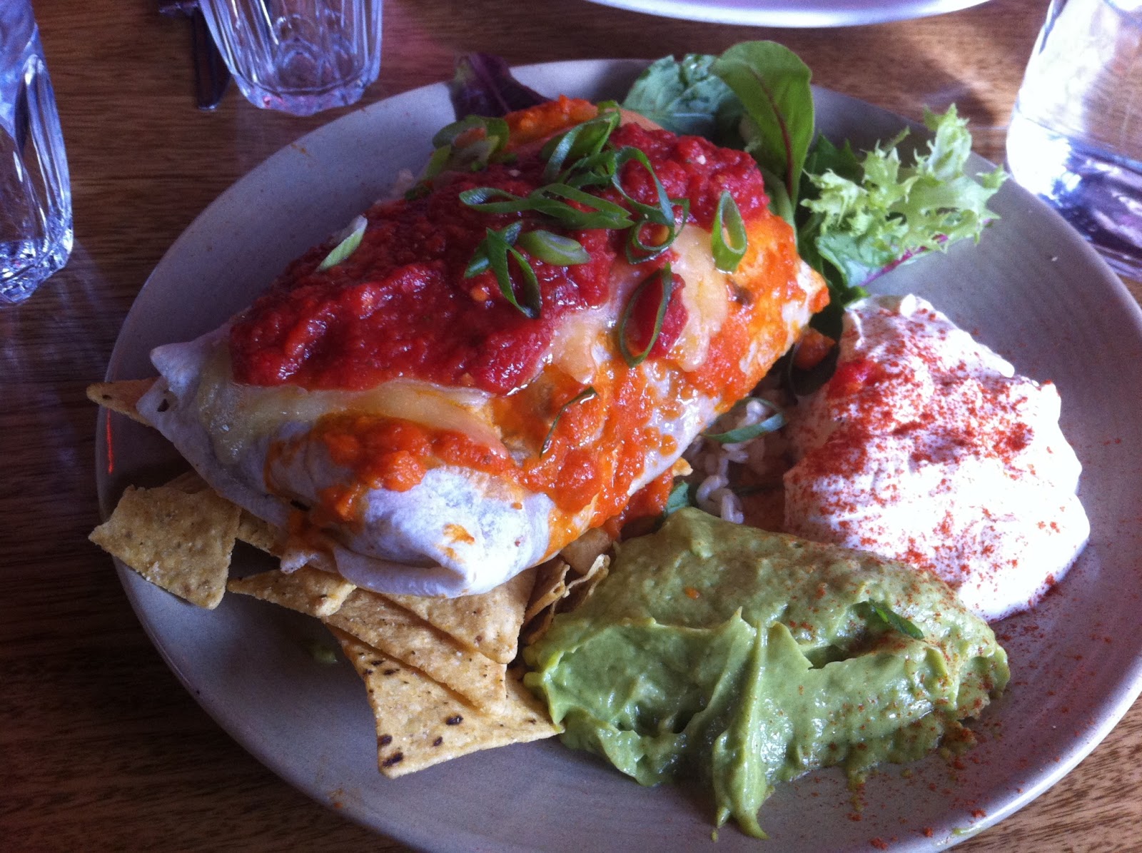 I went for the Mexican Burrito - tortilla bread with refried kidney beans, spinach, onion & mushroom, served with rice, topped with melted cheese, chilli, sour cream & guacamole $14.50